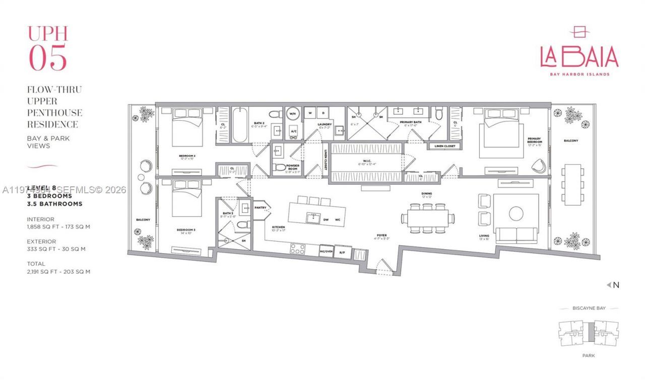 Turnkey property! La Baia Bay Harbor Islands is a new luxury boutique bayfront condominium in Miamis exclusive Bay Harbor Islands. Residence UPH05 is a flow-through unit with 10-foot ceilings, a private terrace, and three bedrooms and three and a half bathrooms, offering stunning ocean, Biscayne Bay, and sunset views.La Baia Bay Harbor Islands offers 30,000 sq. ft. of resort-style amenities, including a 6,000 sq. ft. deck with panoramic views; dedicated kids and adults areas; a rooftop amenity deck with spectacular waterfront views; an expansive rooftop pool; outdoor kitchen; lounge areas; heated soaking spa; splash pad; reflection lawn for yoga, stretching, and meditation; a state-of-the-art fitness center with the latest cardio and weight-training equipment; and a club room with a private bar. Additional amenities include a dockside pick-up and drop-off area and a water sports launch dock with kayaks and more.